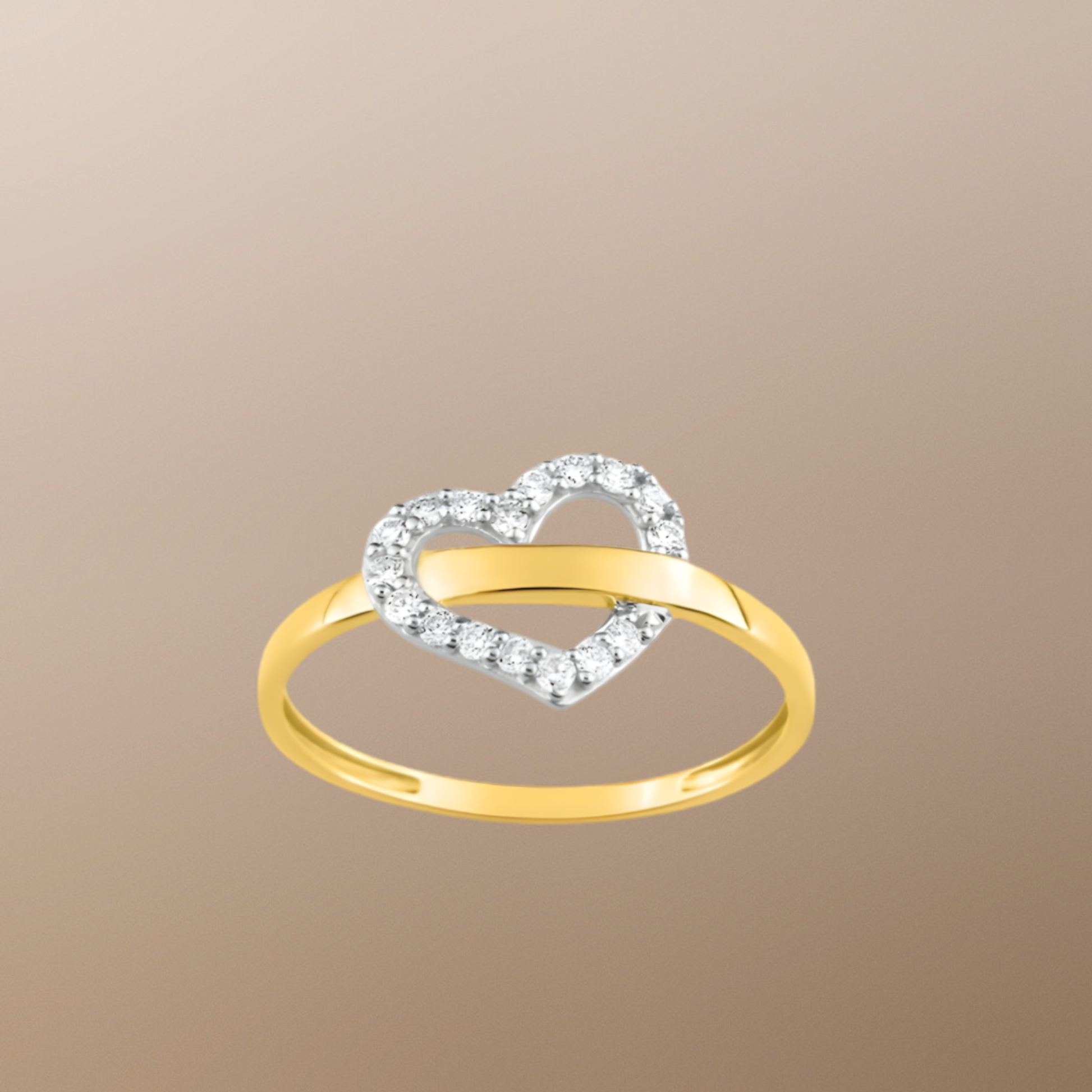 Bague cœur en or jaune 375‰, oxydes de zirconium et anneau traversant
