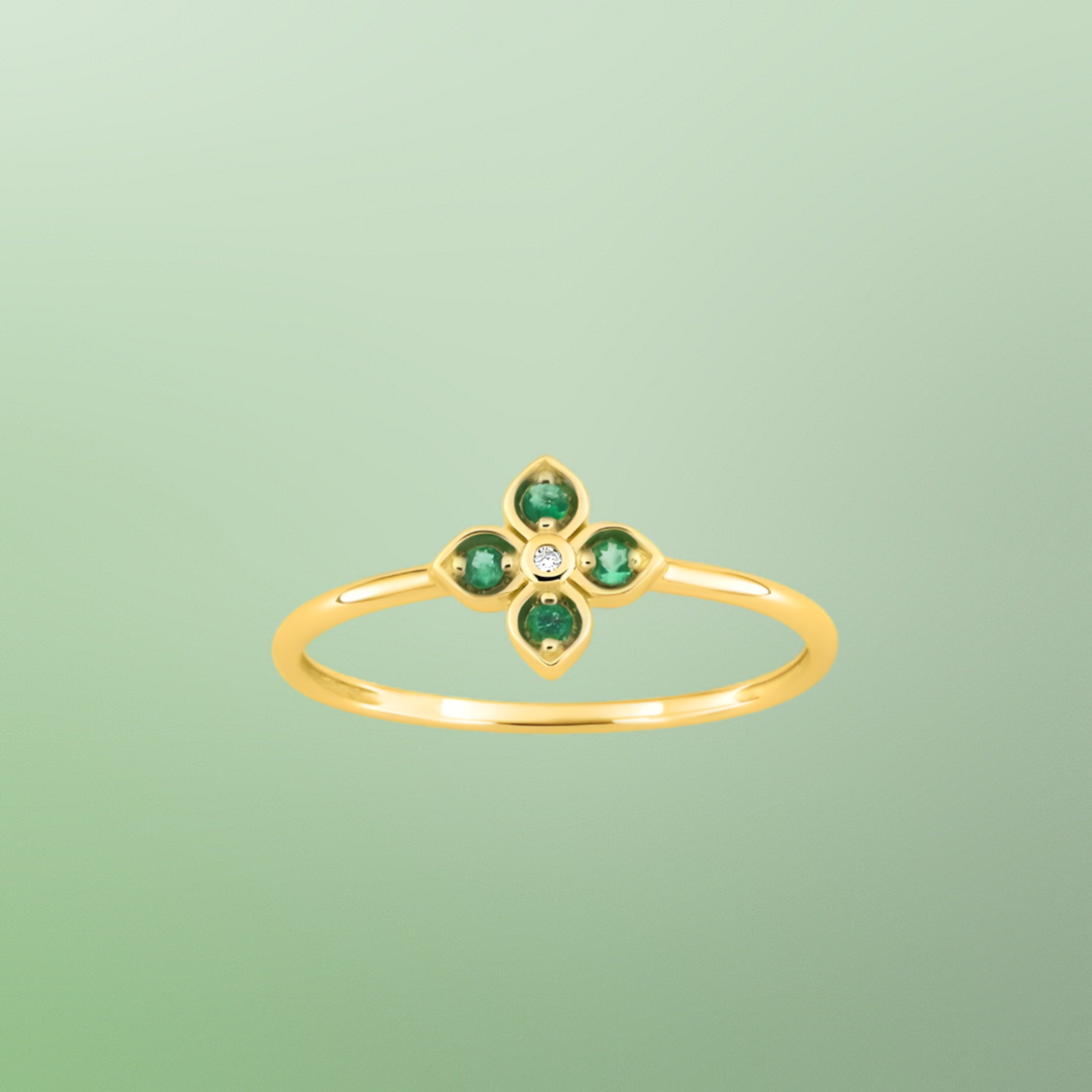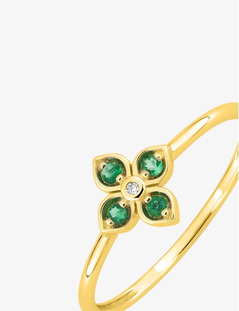 Bague fleur en or jaune 375‰, émeraudes et diamant – Un bijou délicat