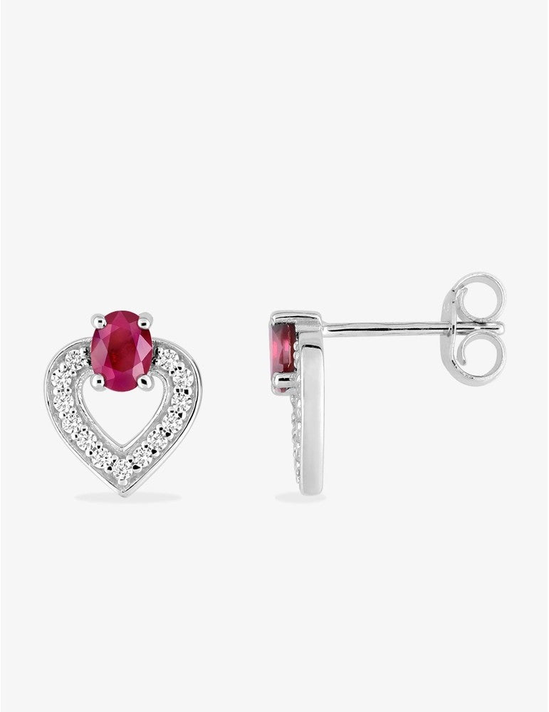 Boucles d'oreilles cœur or blanc 375 ‰, oxydes de zirconium et rubis
