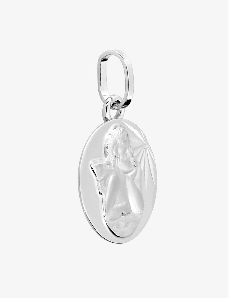Cette médaille ange en or blanc 375‰ (9 carats) est un bijou raffiné et intemporel. Elle est composée d’une plaque ovale diamantée de 15 x 18 mm, sublimée par un petit ange en relief. Montée sur une bélière discrète et élégante, elle affiche un poids d’or moyen de 0,80 g.