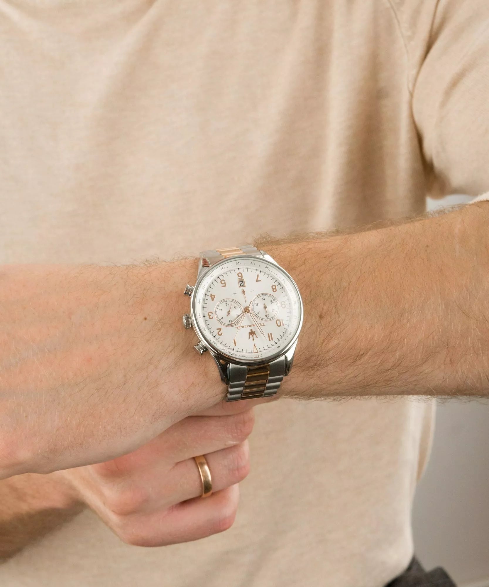 Cadran | Blanc / argenté avec détails or rose, compteurs de chronographe, tachymètre, jour/date chic-time.fr+2zegarek.net+2 |