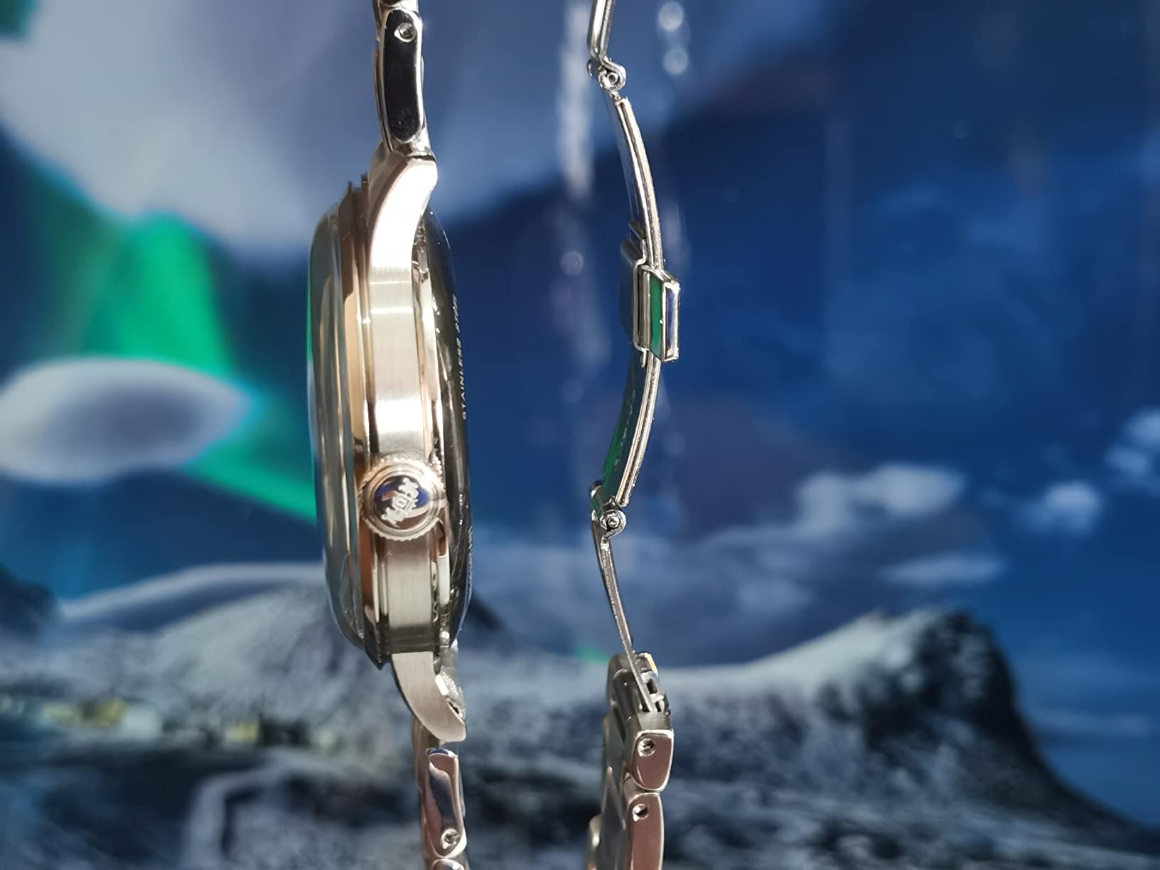Cadran : Vert soleillé avec ouverture à 9h, index argentés et chiffres romains à 6h et 12h