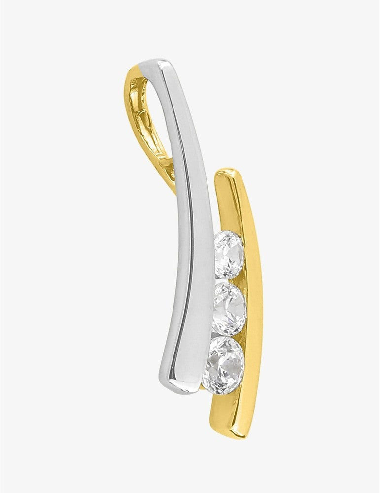 Ce pendentif moderne et raffiné en or jaune 750 ‰ (18 carats) combine élégance et originalité avec son design décalé. Deux brins de métal légèrement courbés viennent pincer trois oxydes de zirconium, apportant une brillance subtile. L'un des brins est fini en rhodium pour ajouter une touche contemporaine. Le pendentif mesure 16 mm de hauteur et possède un poids d'or théorique de 0,50 g, une pièce idéale pour compléter un look sophistiqué.